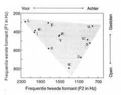 De frequenties van een klinker die versterkt worden door de karakteristieke vorm van het aanzetstuk voor die klinker noemen we deformanten van die klinker. De eerste piek komt overeen met degrondfrequentie (F0), die bepaald wordt door de grondfrequentie waarmee de stembanden trillen. De volgende pieken zijn de formanten; deze zijn genummerd van lage naar hoge frequentie, namelijk F1, F2, enzovoort. Iedere klinker heeft dus een aantal formanten, waarvan de eerste formant (F1) en de tweede formant (F2) voldoende zijn om ze van elkaar te onderscheiden, zoals aangegeven in Figuur 5. De figuur laat zien dat articulatorische dimensies van een klinkerdiagram, namelijk klinkerhoogte en plaats van articulatie, corresponderen met de eerste twee formanten. De hogere formanten (F3 etc.) bepalen de klankkleur van iedere klinker nog verder.