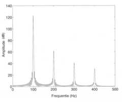 Dit golfpatroon verschilt van klank tot klank. Zo doet er zich in het golfpatroon van stemhebbende klanken, zoals klinkers, bijvoorbeeldperiodiciteit of herhaling voor, die in het golfpatroon van stemloze klanken volledig ontbreekt. Een dergelijk golfpatroon kan nauwkeurig beschreven worden door middel van eenspectrum: een grafiek met op de horizontale as de frequenties en op de verticale as de amplitudes van de golven (zie Figuur 6).Figuur 6. Spectrum van het basisgeluid bij stemhebbend spreken, in de vorm van een ‘zaagtand’ (Bron: Rietveld & Van Heuven 2016: 135)