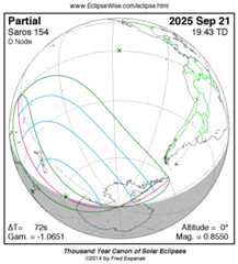 The partial solar eclipse of 2025 Sep 21 is preceded two weeks earlier by a total lunar eclipse on 2025 Sep 07.
