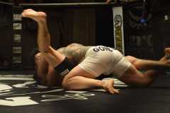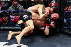 最終ラウンド、いきなりタックルの亮我。ケージ中央で上を取る。足を大きく振り上げながらパスガードを狙う亮我だが、それをさせない関口。体が後ろを向いたところで、バックを取った亮我がリアルネイキットチョークをガッチリ決め勝利した。