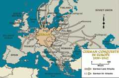 German conquests in Europe, 1939-1942In World War II, Germany sought to defeat its opponents in a series of short campaigns in Europe. Germany quickly overran much of Europe and was victorious for more than two years. Germany defeated and occupiedPoland (attacked in September 1939),Denmark (April 1940),Norway (April 1940),Belgium (May 1940), theNetherlands (May 1940),Luxembourg (May 1940),France (May 1940),Yugoslavia (April 1941), andGreece (April 1941). Yet Germany did not defeat Great Britain, which was protected from German ground attack by the English Channel and the Royal Navy. On June 22, 1941, German forces suddenlyinvaded the Soviet Union. But Germany proved unable to defeat the Soviet Union, which together with Great Britain and the United States turned the tide of battle and ultimately defeated Germany in May 1945.