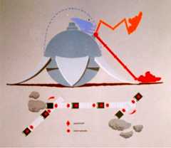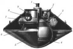 Системы и научное оборудование спускаемого аппарата «Марс-3», совершившего первую в мире мягкую посадку на поверхность Марса: 1 - основная твердотопливная ракета, 2 - система управления, 3 - основной парашют, 4 - посадочный аппарат, 5 - аэродинамический тормозной конус, 6 - антенна радиовысотомера, 7 - парашютный отсек, 8 - антенны ретрансляционной связи, 9 - пиропатрон вывода тормозного парашюта
