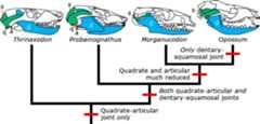 Only in recent years has it become apparent that several lineages of synapsids, including mammals, replaced their quadrate-articular jaw joint with a dentary-squamosal joint. We don’t fully understand why these changes happened. Some evidence suggests that the change in the quadrate-articular complex improved hearing. Other evidence suggests that these changes were a byproduct of early mammals’ increasing brain size. These ideas are not mutually exclusive, of course, and more research is needed. Whatever the functional advantages may have been, the pattern of evolution in these features clearly shows another example of exaptation: the incorporation of the dentary and squamosal bones into the jaw joint, originally alongside the quadrate and articular, eventually allowed the latter two bones to acquire a completely different function and to leave the jaw articulation altogether.