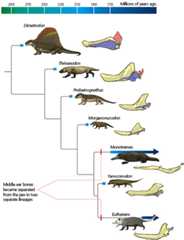 All the animals you see on this evogram are synapsids, the group that gave rise to the mammals. Sometimes synapsids are called “mammal-like reptiles;” however, that is misleading because synapsids are not reptiles. Synapsids and reptiles are two distinct groups of amniotes, animals that produce young that are enveloped with a membrane called an amnion that prevents desiccation. All reptiles (including birds) have eggs with amniotic membranes (which some lay and others retain inside their bodies until hatching). And of course all mammals (the clade of synapsids still alive today) reproduce using an amnion, and those that lay eggs (e.g., the platypus and echidna) produce amniotic eggs.