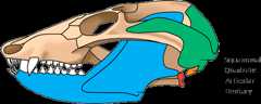 For reasons we don’t fully understand, several lineages of synapsids — including the one that would eventually give rise to the mammals — began to evolve changes in the jaw joint. Originally the quadrate and articular bones formed the jaw joint, but these synapsids (e.g., Probainognathus) evolved a second pair of bones involved in the jaw articulation. The squamosal bone was positioned alongside the quadrate in the upper jaw, and the dentary was positioned alongside the articular in the lower jaw.
