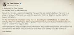 学術発表会から1週間後の2025年3月22日、ハワス氏は自身のFacebookに次のような声明を投稿しています。