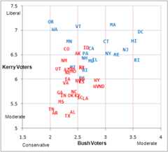 A graph of the Liberalness Scores of Bush and Kerry voters in each state is below.