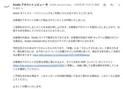 登録メールアドレスを確認したところ、「Amazonからアカウントに関するお知らせ」というメールが届いていました。メールによると、出版した本に「誤解を招くおそれがあるメタデータ」が見つかったため、KDPアカウントを停止したとのこと。