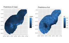 predictions<- predict(modelRun,mesh=mesh,mask=region,spatial=TRUE,fun='linear')plot(predictions,variable= c('mean','sd'))
