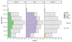 One of the advantages of {apyramid} is that it will adjust to accountfor non-binary categorical variables. For example, in the flu data set,there are two cases with no gender reported. If we setna.rm = FALSE,we can the age distribution of these two cases: