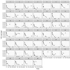 Each panel represents a different individual and the dashed horizontal line is the assay detection threshold. We can see that the data is noisy, individuals have different numbers of observations, and only a subset suppress viral load below the detection threshold.