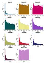 The histogram ofcms score can be read like a p.value histogram and is flat for random batch mixing (batch100).If a batch related bias is present a high number of lowcms scores can be seen (batch0).