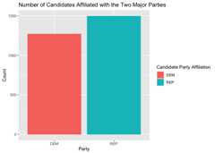 library(ggplot2)ggplot(data, aes(x=cand_pty_affiliation,y=size,fill=cand_pty_affiliation))+ geom_col()+ labs(title="Number of Candidates Affiliated with the Two Major Parties",x="Party",y="Count",fill="Candidate Party Affiliation" )