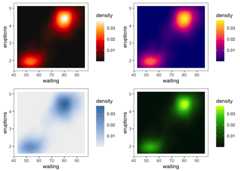 # Load the Librarylibrary("cetcolor")# Get RGB Hexadecimals for graphingcet_pal(5,name="blues")#> [1] "#F1F1F1" "#C0D3EB" "#93B5DD" "#7197C1" "#3B7CB2"# Sample use with ggplot2library("ggplot2")ggplot(faithfuld, aes(waiting,eruptions))+ geom_raster(aes(fill=density))+ theme_bw()+ theme(panel.grid=element_blank())->glibrary("gridExtra")# Frequently used colour maps have "nicknames" see ?cet_color_mapsgrid.arrange(g+ scale_fill_gradientn(colours= cet_pal(5,name="fire")),g+ scale_fill_gradientn(colours= cet_pal(5,name="inferno")),g+ scale_fill_gradientn(colours= cet_pal(5,name="blues")),g+ scale_fill_gradientn(colours= cet_pal(5,name="kgy")),ncol=2,nrow=2)