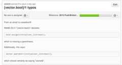 ![]() If you've already checked out the standard sources, and you were able to fix the issue yourself, submit a githubpull request with your fix. Alternatively, for small (obviously correct) edits such as typo fixes, you can edit the sources and submit a pull request directly from github. This can shorten the time it takes to apply your fix considerably, and is always appreciated! Thanks! | ![]() If you are unable to provide a patch, create an issue in theissue tracker. |