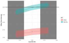 Note that in this plot one can clearly see that the magnitude of thedifferences between the groups depends upon scale location, as evidenceby the reversal of the effect (negative to positive) for the Non-ELL(non-English Language Learners) group. We could also change thereference group, change the level of quantile binning, and evaluate theeffect within other factors. For example, we can look by seasoneligibility for free or reduced price lunch, with quantiles binning, andnon-ELL students as the reference group with
