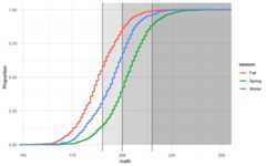 ecdf_plot(benchmarks,math~season,cuts= c(190,200,215))