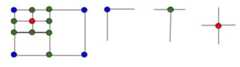 所有的矩形的四个顶点只会有下面蓝,绿,红三种情况,其中蓝表示该顶点周围没有其他矩形,T型的绿点表示两个矩形并排相邻,红点表示四个矩形相邻,那么在一个完美矩形中,蓝色的点只能有四个,这是个很重要的判断条件。我们再来看矩形的四个顶点,我们按照左下,左上,右上,右下的顺序来给顶点标号为1,2,4,8,为啥不是1,2,3,4呢,我们注意它们的二进制1(0001),2(0010),4(0100),8(1000),这样便于我们与和或的操作,我们还需要知道的一个判定条件是,当一个点是某一个矩形的左下顶点时,这个点就不能是其他矩形的左下顶点了,这个条件对于这四种顶点都要成立,那么对于每一个点,如果它是某个矩形的四个顶点之一,我们记录下来,如果在别的矩形中它又是相同的顶点,那么直接返回false即可,这样就体现了我们标记为1,2,4,8的好处,我们可以按位检查1。如果每个点的属性没有冲突,那么我们来验证每个点的mask是否合理,通过上面的分析,我们知道每个点只能是蓝,绿,红三种情况的一种,其中蓝的情况是mask的四位中只有一个1,分别就是1(0001),2(0010),4(0100),8(1000),而且蓝点只能有四个;那么对于T型的绿点,mask的四位中有两个1,那么就有六种情况,分别是12(1100), 10(1010), 9(1001), 6(0110), 5(0101), 3(0011);而对于红点,mask的四位都是1,只有一种情况15(1111),那么我们可以通过直接找mask是1,2,4,8的个数,也可以间接通过找不是绿点和红点的个数,看是否是四个。最后一个判定条件是每个矩形面积累加和要等于最后的大矩形的面积,那么大矩形的面积我们通过计算最小左下点和最大右上点来计算出来即可, 参见代码如下:
