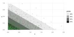 One potential danger here is that the estimated HDRs are computed basedon not the estimated density directly, but a discretization of it. Thisis how all non-parametric density estimation in R works,e.g. MASS::kde2d(), and most parametric density estimation, too. Inother words: the density estimate itself is only known at points on agrid over thex-y aesthetic space. As a consequence, if that rangeis too small, it’s possible that a probabilistically non-trivialproportion of the density is excluded from the computations, biasing theresulting HDRs.