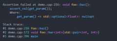 ASSERT(vec.size() > min_items(), "vector doesn't have enough items", vec);std::optional<float>get_param();float f = *ASSERT_VAL(get_param());