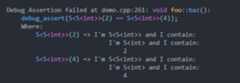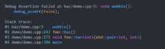 #include<libassert/assert.hpp>voidzoog(const std::map<std::string,int>& map) {DEBUG_ASSERT(map.contains("foo"),"expected key not found", map);}