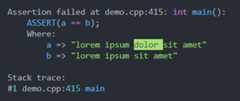 The most important feature this library supports is automatic expression decomposition. No need forASSERT_LT or othersuch hassle,assert(vec.size() > 10); is automatically understood, as showcased above.