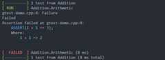 #include<libassert/assert-gtest.hpp>TEST(Addition, Arithmetic) {ASSERT(1 +1 ==3);}