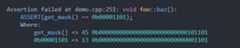 voidhandler(const assertion_info& info) {throwstd::runtime_error("Assertion failed:\n" + assertion.to_string());}intmain() {libassert::set_failure_handler(handler);}