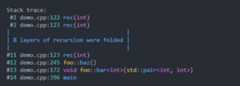 A lot of work has been put into generating pretty stack traces and formatting them as nicely as possible.Cpptrace is used as a portable and self-contained solution for stacktracespre-C++23. Optional configurations can be found in the library's documentation.