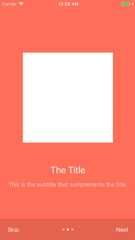 bottomBarHeight(optional): a number for the height of the bottom bar. Defaults to60.bottomBarColor(optional): backgroundColor of the bottom bar. Defaults totransparent.bottomBarHighlight(optional): a bool flag indicating whether the bottom bar should be highlighted. Defaults totrue.controlStatusBar(optional): a bool flag indicating whether the status bar should change with the background color. Defaults totrue.showPagination(optional): whether to show the bottom pagination bar. Defaults totrue.flatlistProps(optional): additional props for theFlatList which holds all the pages.transitionAnimationDuration(optional): The duration in milliseconds for the animation of the background color for the page transition. Defaults to500.allowFontScalingText(optional): Font scaling can cause troubles with high-resolution screens. You may want to disable it. Defaults totrue.allowFontScalingButtons(optional): Font scaling can cause troubles with high-resolution screens. You may want to disable it. Defaults totrue.pageIndexCallback(optional): a function that receives the pageindexas a parameter on page change.Example Usage