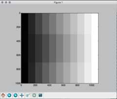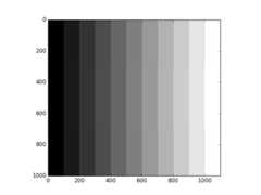 import numpy as npimport matplotlib.pyplot as pltfrom matplotlib.patches import Rectanglecolor = np.zeros(3)f, ax = plt.subplots()im = np.zeros((1000, 1100,3))for i in range(11): im[:,i*100:(i+1)*100,:] = np.tile(np.array([[color]]), (1000, 100, 1)) ax.add_patch(Rectangle((i*100,300), 100, 400, linewidth=0, facecolor=color)) color = color + 0.1plt.imshow(im)plt.show()