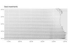 Theggplot2 example for seal movements is easily reproduced, withappropriately scaled arrowhead sizes. Here, the vecsize is set to zeroto not resize the vectors.