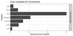 We can useplot() to examine the dual variables for each constraint,which represent how active that constraint is at the optimal point.Highly active constraints affect the objective function value the mostwhen their tolerances are changed.