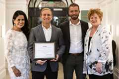Lupita Sanchez-Cornejo, Chair of The Board for the Hollywood Chamber of Commerce; Jeff Isenstadt, President/Chief Executive Officer, JCI Development, Inc.; Kyle Sorgel, Partner, True USA; and Kathleen Rawson, President of the Hollywood Partnership, officially cut the ribbon at The Harlan Residences on April 7, 2022. (Photo courtesy of Kyle Joseph Buckley)