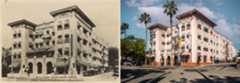Left: Vintage postcard showing the Hillview Apartment Hotel in 1929. (Photo courtesy of California State Library) Right: The Harlan Residences in 2022. (Photo courtesy of Kyle Joseph Buckley)