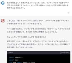 例えば「本しゃぶり」をスクレイピングしようとした時のことだ。今のChatGPTはネット接続が制限されているため、直接情報を取得することができない。そこでお姉ちゃんがPythonコードを用意し、俺が実行することになった。