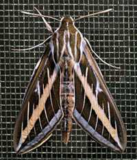 The white-lined sphinx moth,Hyles lineata, is a common “hawk moth” (Family Sphingidae) that occurs throughout most of North America, from southern Canada down to Central America. It does not survive our harsh winters but moves up from the south most springs. Moths first appear in mid-May and a second flight occurs in late August to September, although abundance varies from year to year. Larvae can occasionally occur in tremendous numbers and can move in hordes in search of food, consuming entire plants and covering roadways in slick masses. Such explosive outbreaks, especially common in the dry country of the west, provide moths that emigrate to colonize more northern areas. There are normally at least two generations per year, with multiple generations in warmer climates.