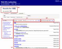 The Classification Number Search allows users to search for authority data for Geographic Name, Uniform Title, Work, and Topical Term by representative classification numbers from the Nippon Decimal Classification (NDC) 9th Revised Edition, NDC 10th Revised Edition orthe National Diet Library Classification (NDLC), which are assigned to the authority data. Users can choose either from a dropdown list ((a) in Figure 2) to search. In addition to searching for exact matches, users can do a prefix search by adding either a half-width asterisk (*) or full-width asterisk (*) at the end of the search string.