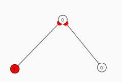 Figure 1: Conjunction NetworkWe may interpret the top (output) unit as representing the truth value of a conjunction (that is, activation value 1 = true and 0 = false) and the bottom two (input) units as representing the truth values of each conjunct. The input units each have an excitatory connection to the output unit, but for the output unit to activate the sum of the input unit activations must still exceed a certain threshold. The threshold is set high enough to ensure that the output unit becomes active just in case both input units are activated simultaneously. Here we see a case where only one input unit is active, and so the output unit is inactive. A disjunction network can be constructed by lowering the threshold so that the output unit will become active if either input unit is fully active. [Created using Simbrain 2.0]