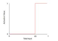 One common sort of connectionist system is the two-layer feed-forward network. In these networks, units are segregated into discrete input and output layers such that connections run only from the former to the latter. Often, every input unit will be connected to every output unit, so that a network with 100 units, for instance, in each layer will possess 10,000 inter-unit connections. Let us suppose that in a network of this very sort each input unit is randomly assigned an activation level of 0 or 1 and each weight is randomly set to a level between -0.01 to 0.01. In this case, the activation level of each output unit will be determined by two factors: thenet influence of the input units; and the degree to which the output unit is sensitive to that influence, something which is determined by itsactivation function. One common activation function is the step function, which sets a very sharp threshold. For instance, if the threshold on a given output unit were set through a step function at 0.65, the level of activation for that unit under different amounts of net input could be graphed out as follows: