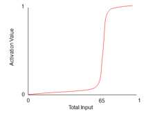 Thus, if the input units have a net influence of 0.7, the activation function returns a value of 1 for the output unit’s activation level. If they had a net influence of 0.2, the output level would be 0, and so on. Another common activation that has more of a sigmoid shape to it – that is, graphed out it looks something like this: