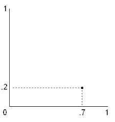 One common way of making sense of the workings of connectionist systems is to view them at a coarse, rather than fine, grain of analysis — to see them as concerned with the relationships between different activation vectors, not individual units and weighted connections. Consider, for instance, how a fully trained Elman network learns how to process particular words. Typically nouns like “ball,” “boy,” “cat,” and “potato” will produce hidden unit activation vectors that are more similar to one another (they tend toclustertogether) than they are to “runs,” “ate,” and “coughed”. Moreover, the vectors for “boy” and “cat” will tend to be more similar to each other than either is to the “ball” or “potato” vectors. One way of determining that this is the case is to begin by conceiving activation vectors as points within a space that has as many dimensions as there are units. For instance, the activation levels of two units might be represented as a single point in a two-dimensional plane where the y axis represents the value of the first unit and the x axis represents the second unit. This is called thestate space for those units. Thus, if there are two units whose activation values are 0.2 and 0.7, this can be represented as the point where these two values intersect (Figure 5).