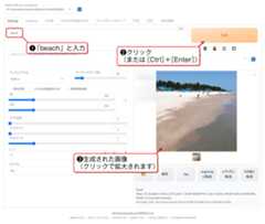 プロンプト欄に「beach」(砂浜)と入力して、「生成」ボタンを押してみると、下のような砂浜の画像が生成される。