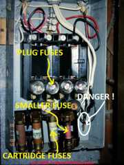 inspectapedia.com/electric/Fuse-Replacement.php BLOWN FUSE REPLACEMENTIn the U.S. those Bakelite plastic electrical components were enclosed in a steel panel box. In the U.K. and some other countries, in the 1950s there were indeed some fuse box enclosures made entirely of Bakellite.