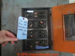 Outside at another house corner (shown above) was an old abandoned A-frame electrical meter box. My client is pointing to the old meter base in the photo. The cable ran out of this box and up the building wall to an end where we could see that it had been hack-sawn off. More of the cable sawn-ends were visible inside the meter pan.
