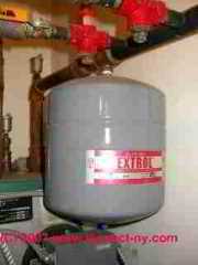 The photo at page top shows a modern Extrol(R) bladder-type heating system expansion tank. At left over our client's head is a reddish tan steel heating boiler expansion tank (or compression tank in some texts).