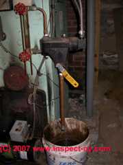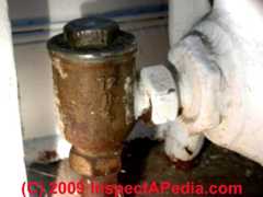 Watch out: The steam heating boiler TP valve shown at left is leaking and lacks its discharge tube - this is an unsafe installation.