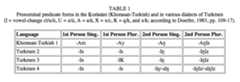SeeTABLE 1 for the pronominal predicate forms in the Ḵorāsāni (Khorasan-Turkish) and in various dialects of Turkmen (I = vowel-change ı/i/u/ü, U = u/ü, A = a/ä, X = x/χ, K = q/k, and x/k; according to Doerfer, 1983, pp. 109-17).
