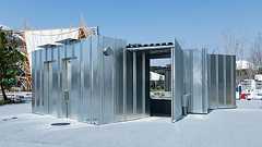外側は、工事現場の仮囲いなどに使われる安全鋼板によって囲われ、その内部にトイレブースと以前の夢洲を再現した中庭を配する。全体の平面形は、トイレブースのユニット単位でずれながら、ブースのないところは安全鋼板の壁を組み合わせて、なにか生き物のような不整形なかたちをつくる。個室ブースから中庭に出て、夢洲のかつての風景が広がる様子を見ながら万博会場の広場に戻っていく動線となり、トイレブースから中庭側に持ち出された屋根は、出口までの動線上に架かり雨風をしのぐ。
