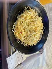 晩御飯もラウンジでいただきました。ペペロンチーノです。